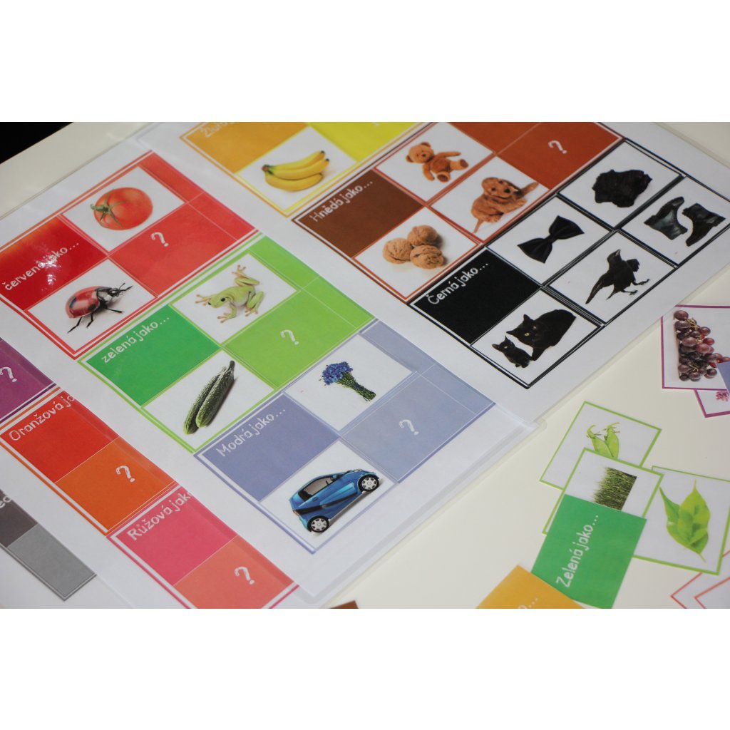 Od každé barvy obsahuje 5 obrázků. Aktivitu lze vzít i na cesty jen s malou kartičkou s názvem barvy. Pokud si vytisknete kartičky 2x, lze s nimi hrát např. pexeso, nebo použít malou barevnou kartičku a jeden z obrázků jako malé pexeso o 11 párech, kdy dítě hledá barvu a obrázek do páru.