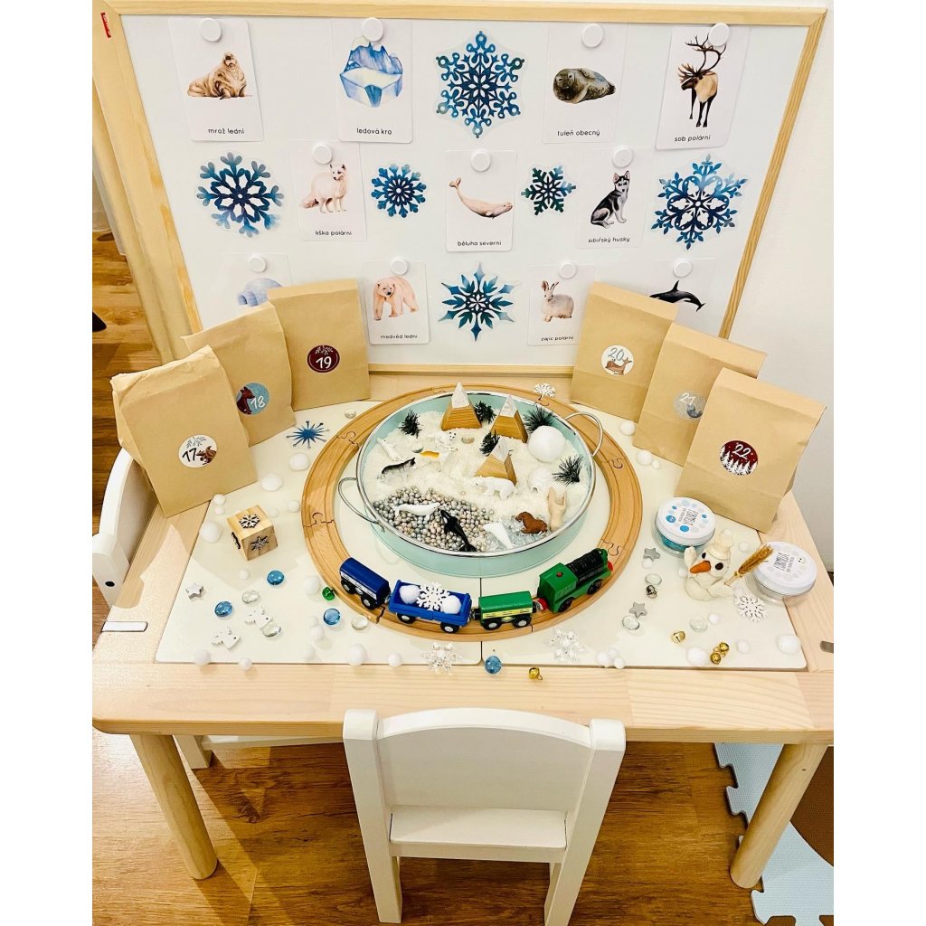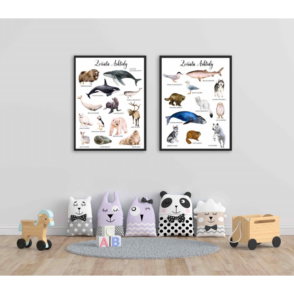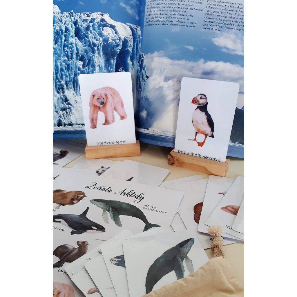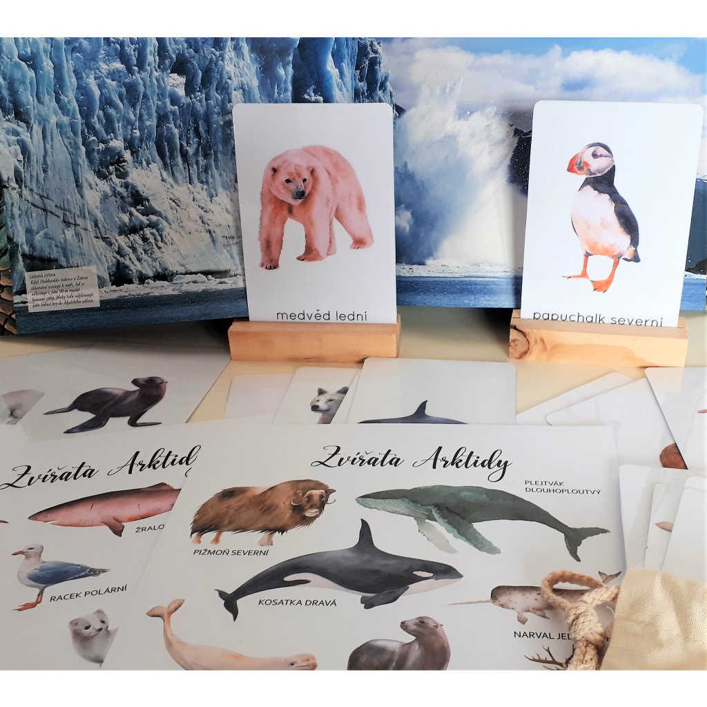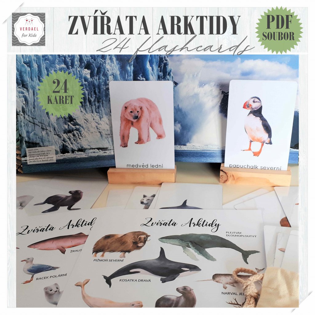 Sada 24 demonstračních karet (flashcards) arktických zvířat se 2 plakáty A3 ve 2 barevených provedeních (s bílým a šedým pozadím)