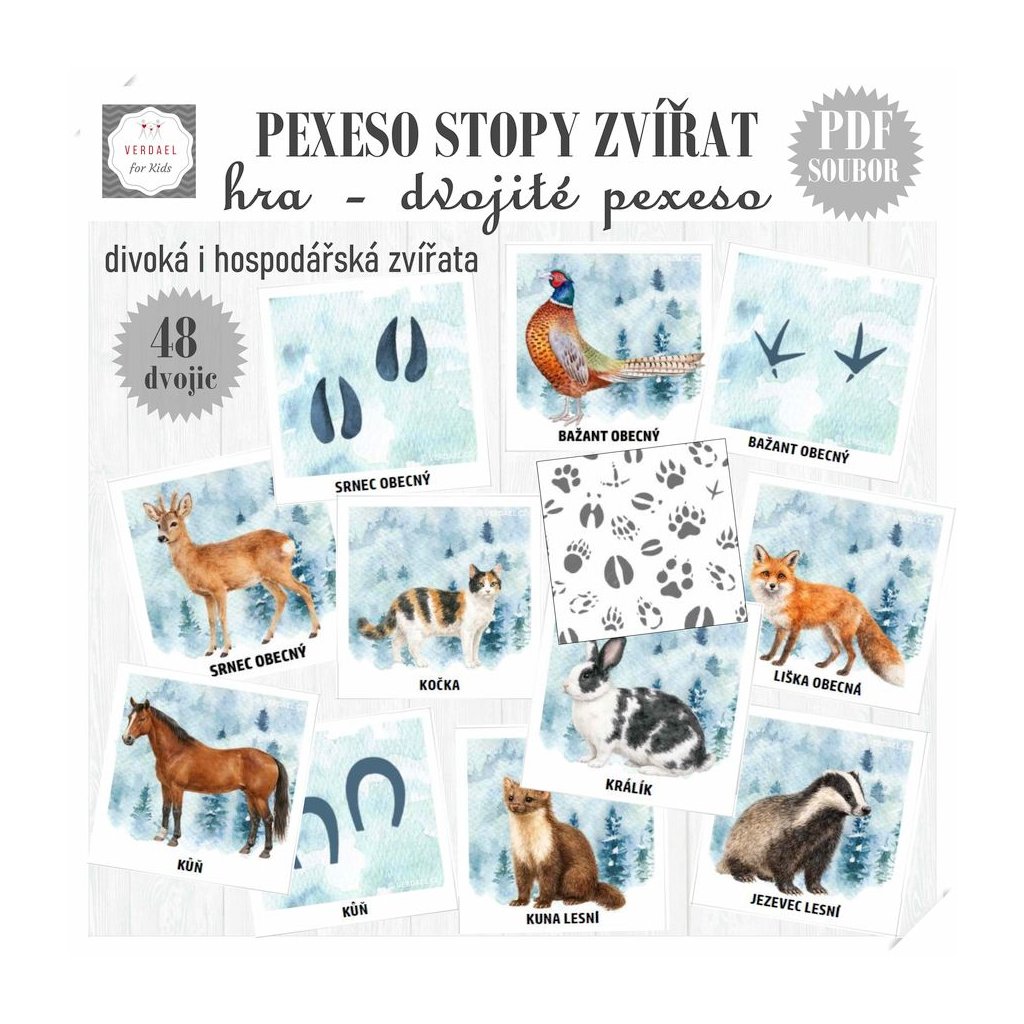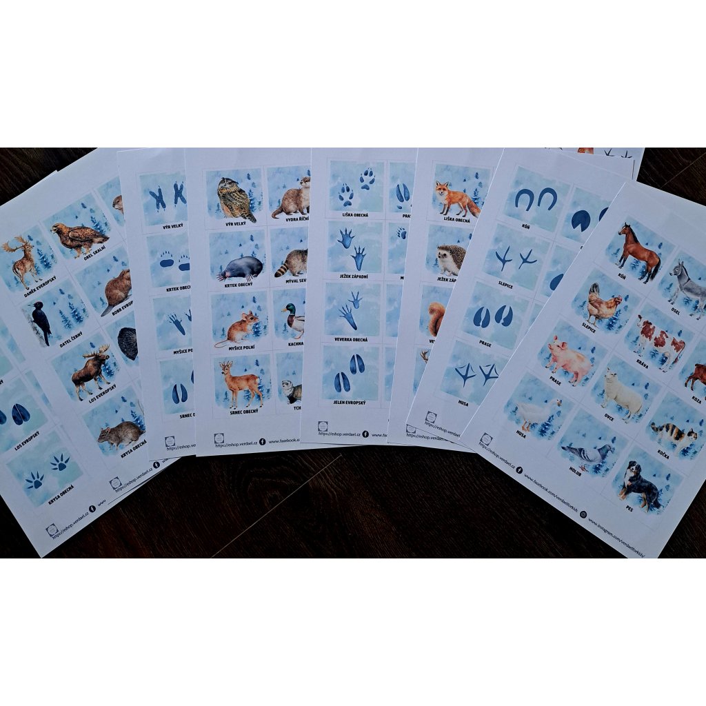 Pexeso procvičující paměť ale i učící poznat stopy zvířat. Ať už lesních nebo hospodářských. Pexeso je velmi obsáhlé - rozsahem ho lze rozdělit na 2 pexesa každé o 48 kartičkách.