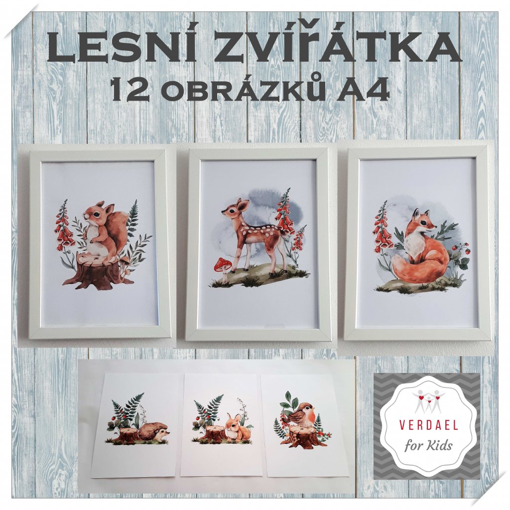 14 kvalitních obrázků A4 roztomilých lesních zvířátek (2 obrázky jsou ve 2 variantách s pozadím i bez něj)