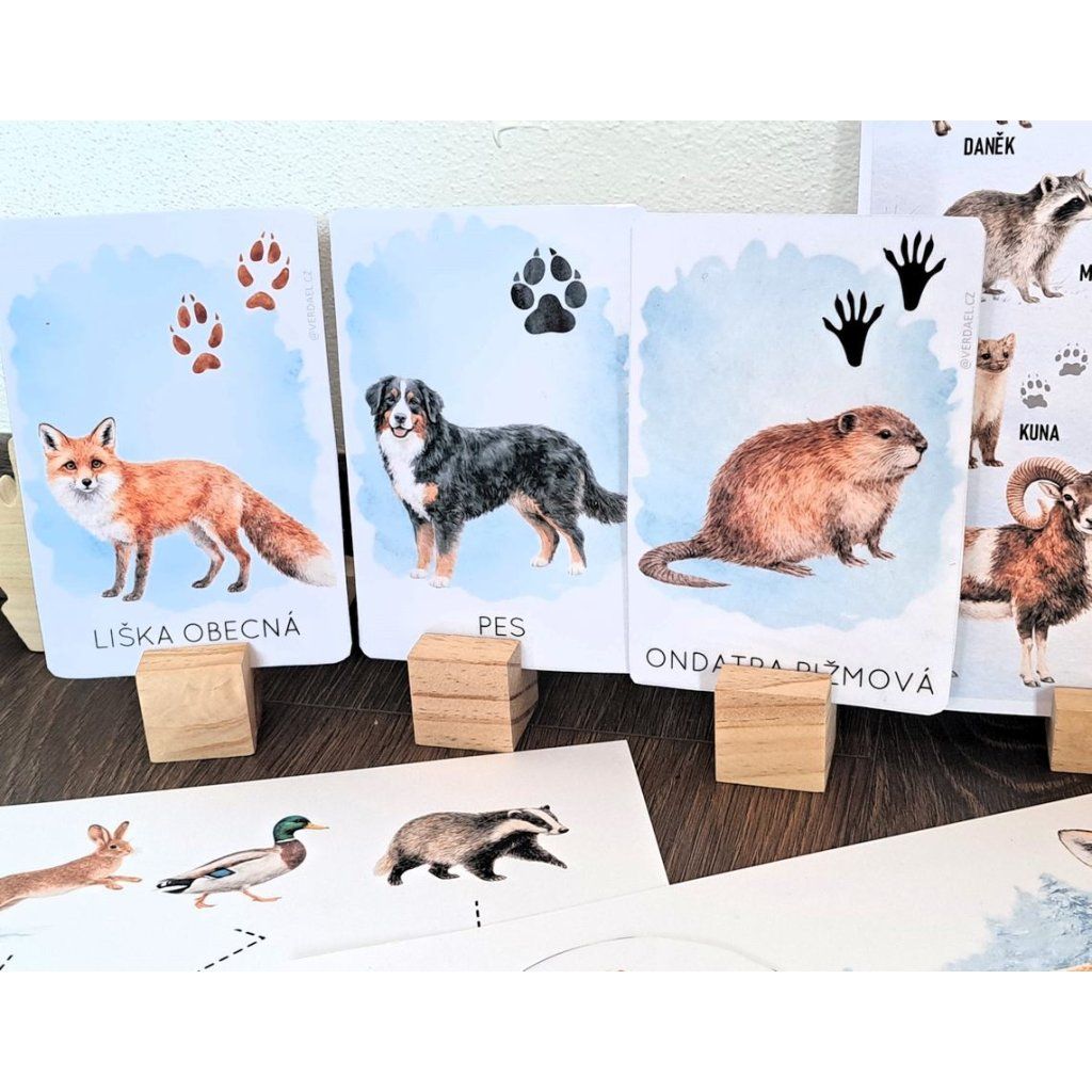 - Dvousložkové karty stopa a název zvířete – určené pro děti, které již umí číst. Ke kontrole správného přiřazení stopy a názvu zvířete poslouží demonstrační karty, čímž vytvoříte třísložkové karty.