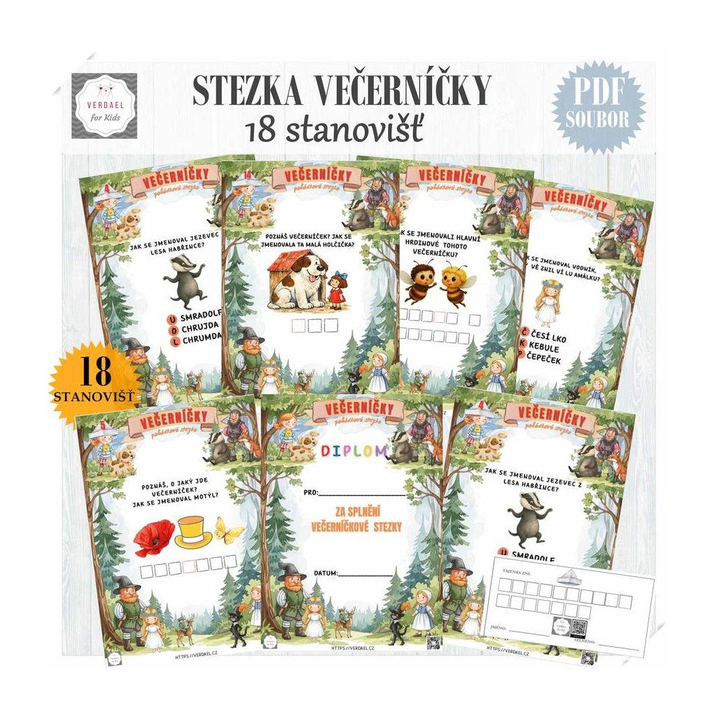 Jde o tištěnou pohádkovou stezku ve formátu PDF, kterou si po zakoupení stáhnete a vytisknete. Děti plní úkoly na jednotlivých stanovištích, poznávají postavy z českých večerníčků a za správné odpovědi sbírají písmena do tajenky, která vyjde KRKONOŠSKÉ POHÁDKY (můžete zkrátit i jen na POHÁDKY)